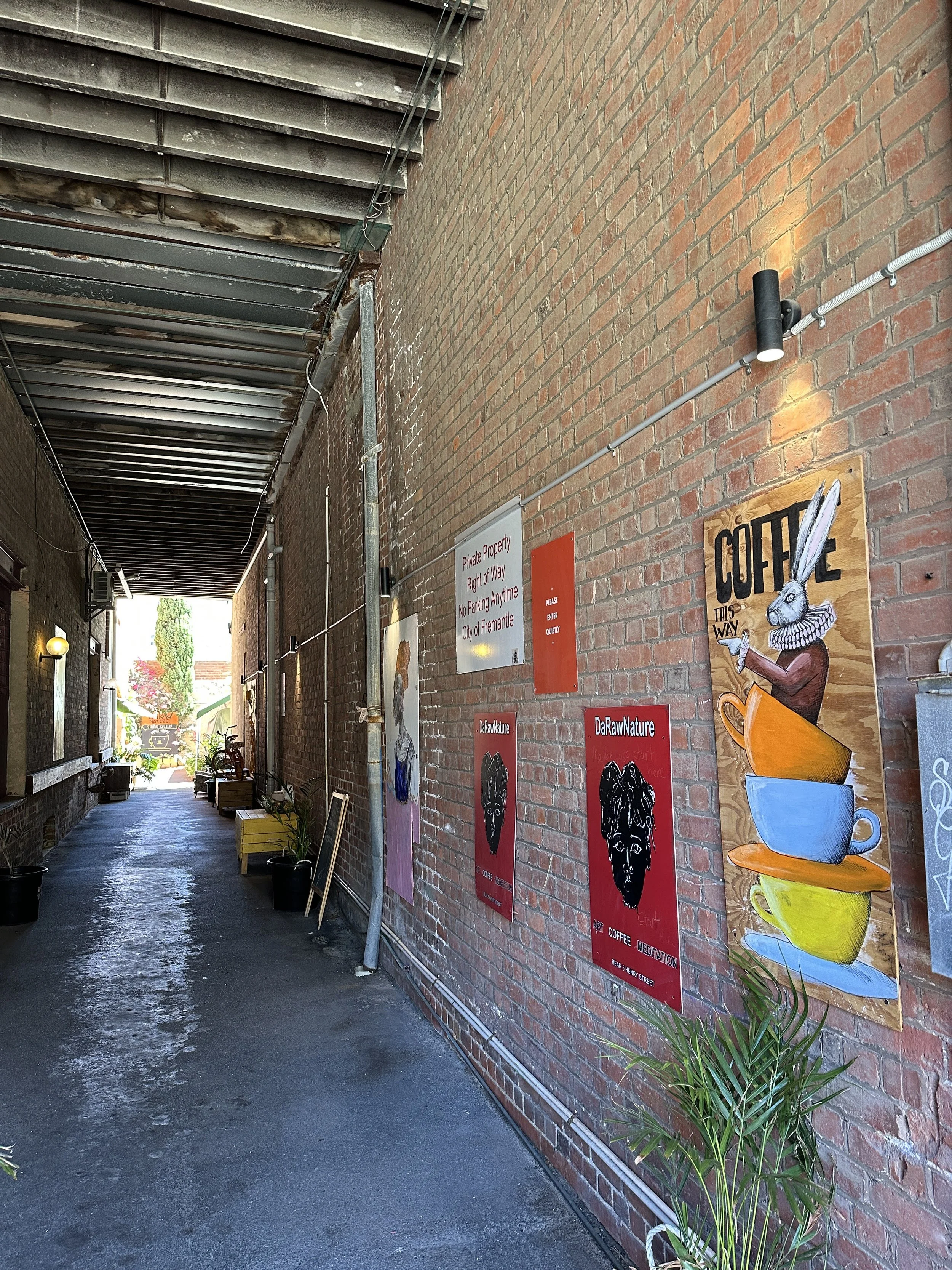 Our next destination was Fremantle Market, a large public market with various food and craft vendors. On the way there, we saw a sign that said ‘coffee and art’ with an arrow pointing down a side street. We were actually a bit thirsty, so a quick coffee break sounded wonderful, so off we went to DaRawNature Coffee Lounge. Immediately upon entering the alleyway leading to the cafe, the art aspect was evident: