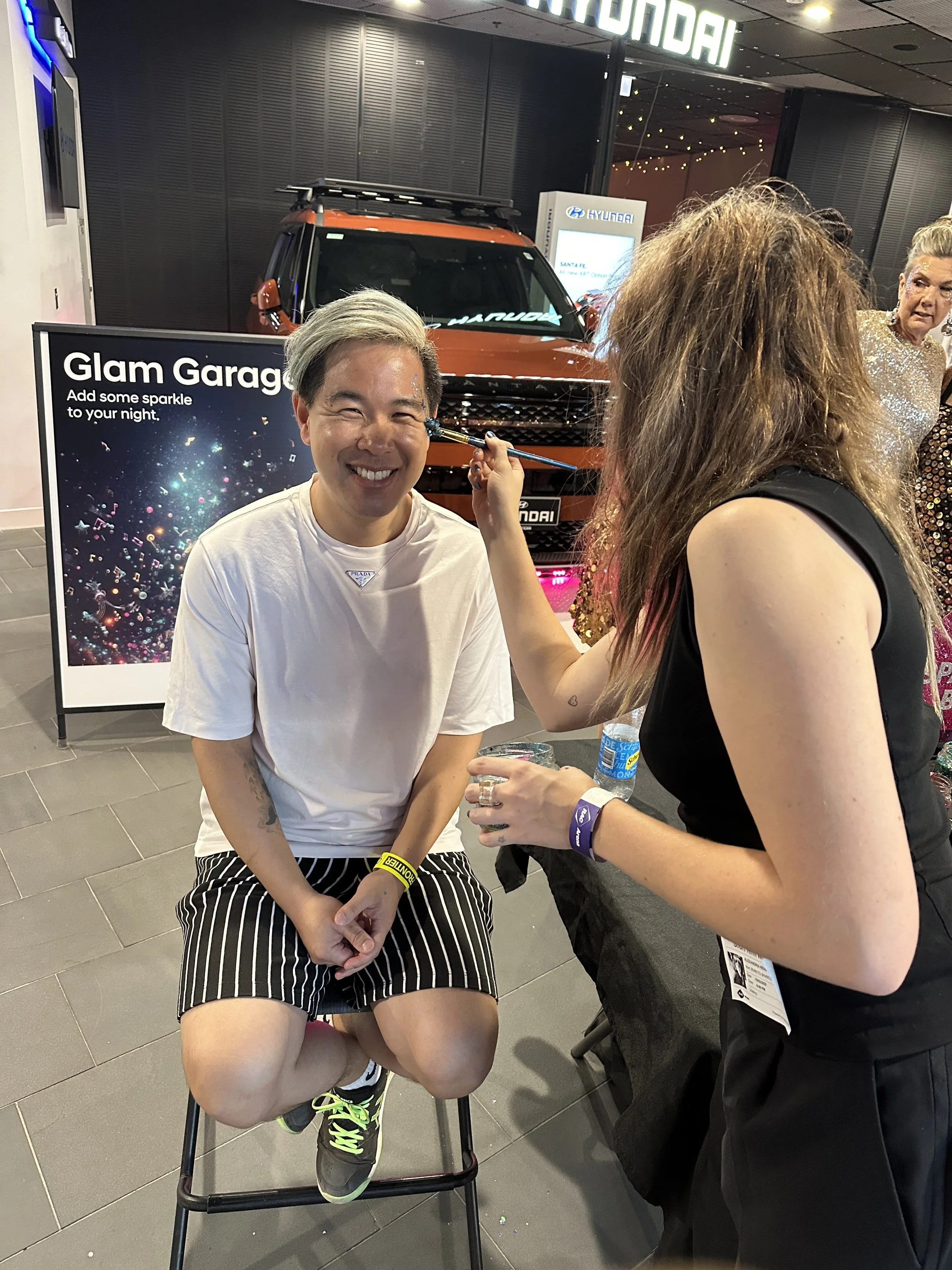 And then I saw a sign for the ‘glam garage,’ which was placed next to a Hyundai SUV, so I assumed it had to do with the car. However, someone else informed me that there was a sparkle bar nearby, where they were offering free body glitter application, and I couldn’t pass up that opportunity. They had many colors to choose from: