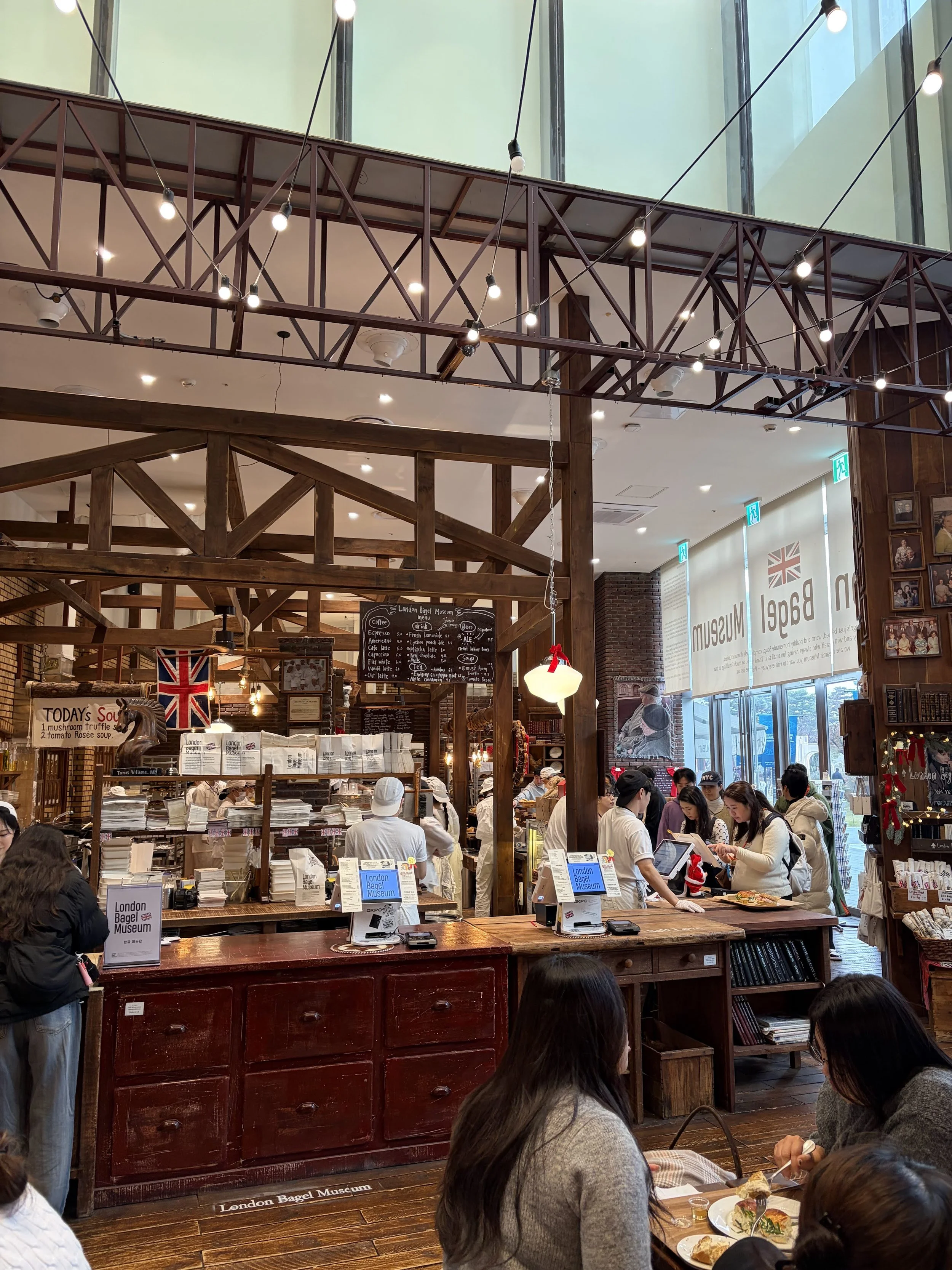 After not really eating anything at Lotte World, we were all getting hungry, so as we were walking towards Lotte World Tower, I saw a sign for the London Bagel Museum, a chain featuring various bagels and bagel sandwiches. The decor of the place was cool with its brick and wood, and British themed art, although we weren’t sure what was British about bagels: