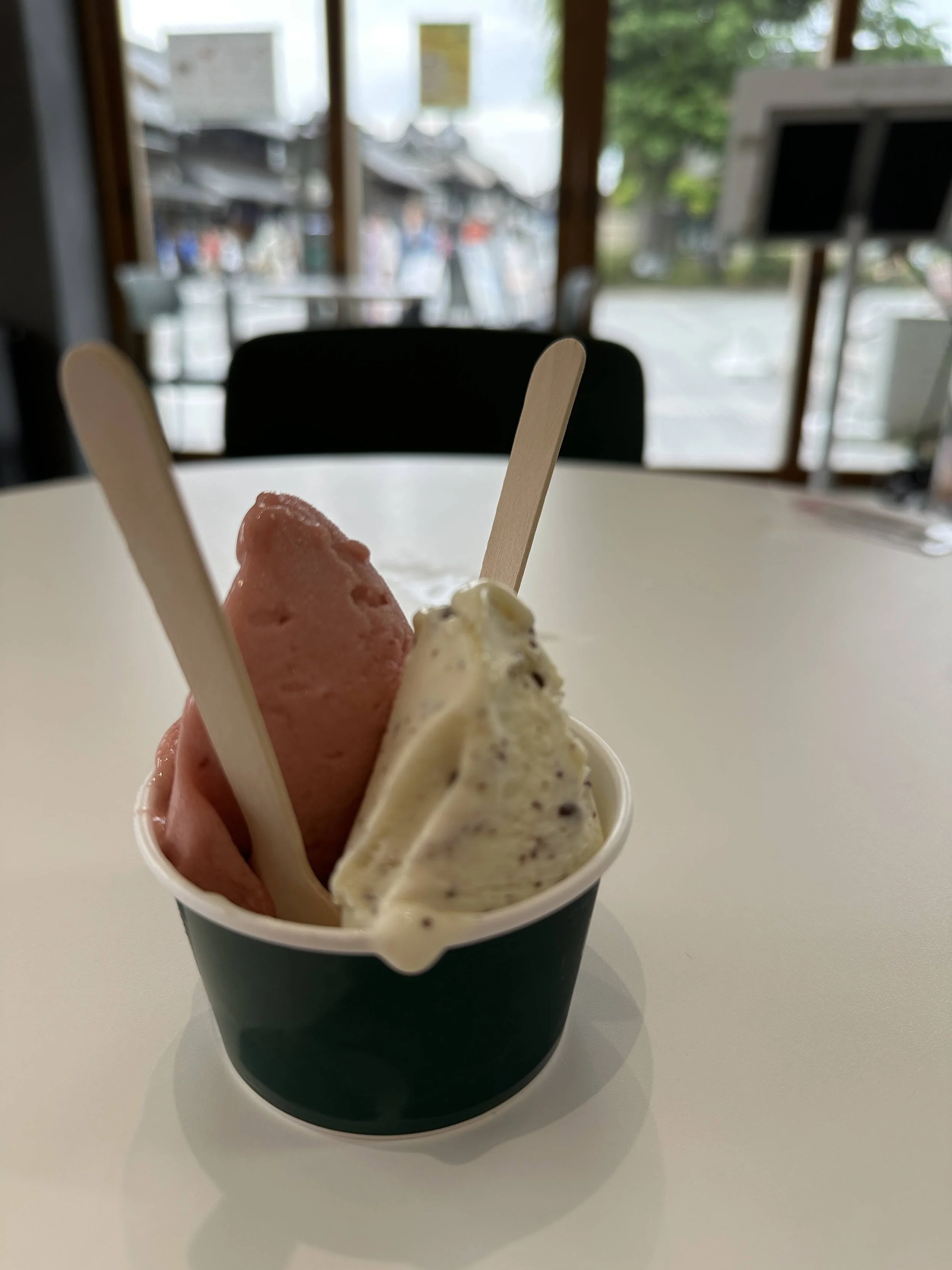 We initially thought that the interesting part of the town was the one main street, but we were pleasantly surprised to find the numerous side streets that also had tons of stores and cute homes. If we had more time, we would have walked around a bit more. However, we did stop by a couple of shops to get a sweet potato dumpling and some ice cream: