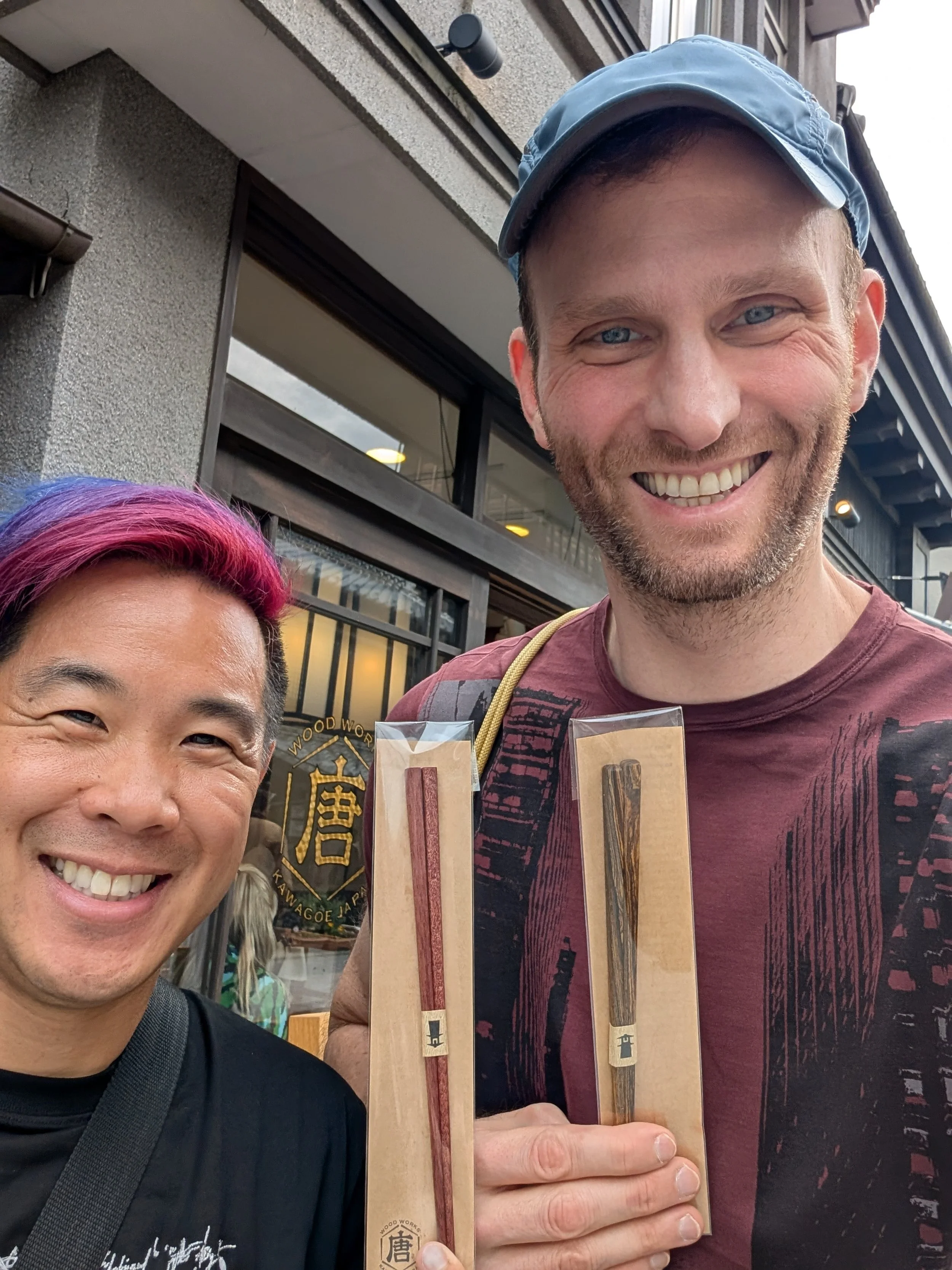 On the way back to the station, I wanted to stop by a chopstick store, Karakimokkou, that I remembered seeing on the way in. It turns out though that it wasn’t just a chopstick store, but a woodworking shop where you make your own chopsticks. We had time and thought it would be a fun activity (and we’ve both done wood shop in the past). First, you find the wood you want to use from a display. Each type of wood has its own price and also the store’s guide on how hard the wood is and how difficult the process of making the chopsticks with that wood would be. Neither of us wanted to go with plain brown wood, so I opted for a burgundy wood and Nick chose a black wood.