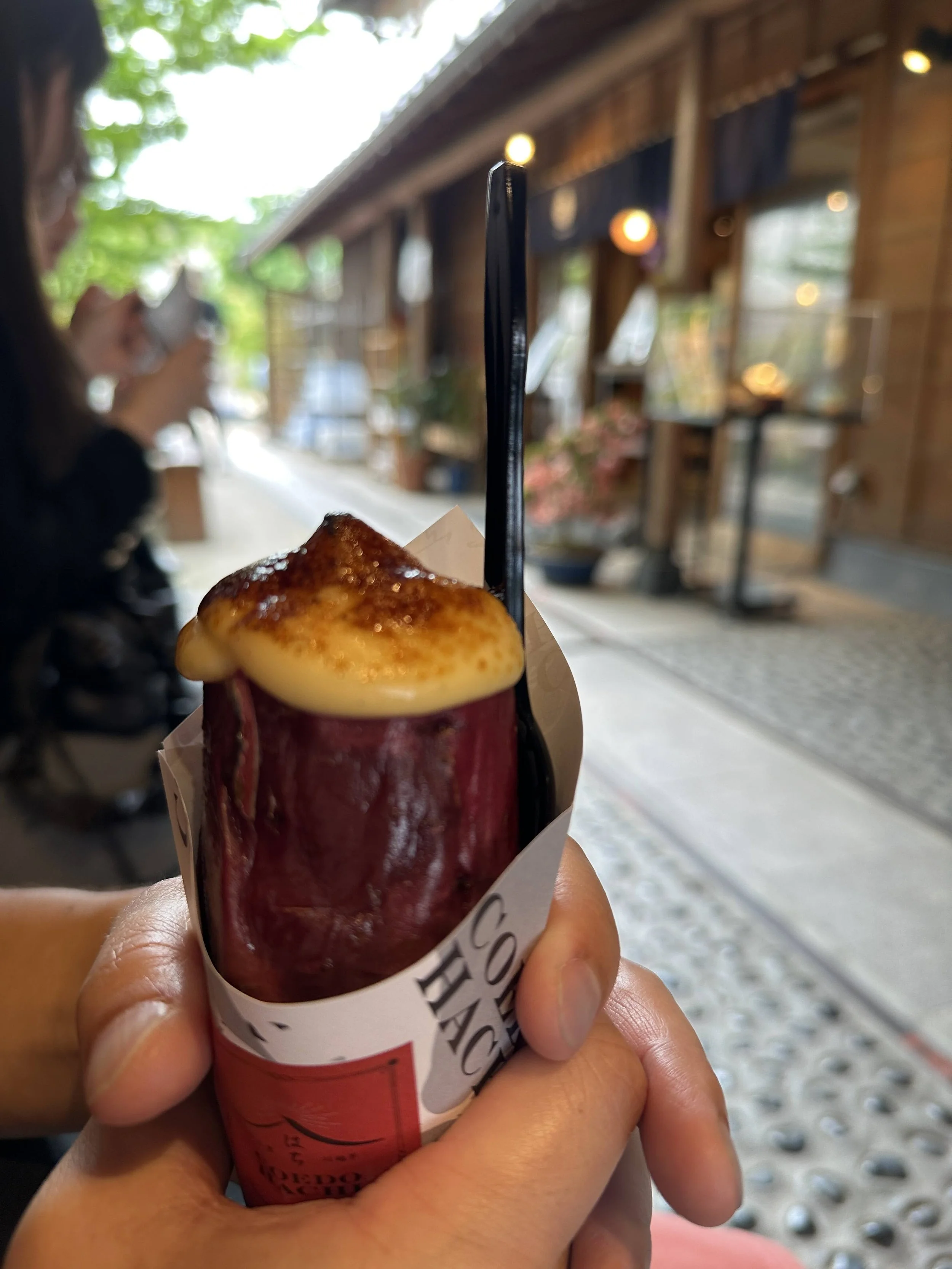 We headed back to the warehouse district to explore the various stores and small streets. A popular snack to get in the area is roasted sweet potato (or yaki-imo). There are many stores selling various varieties of yaki-imo, either plain, in a dumpling, or in ice cream. We started off with a roasted yaki-imo brulee, which is a cut roasted sweet potato filled with custard and bruleed on top: