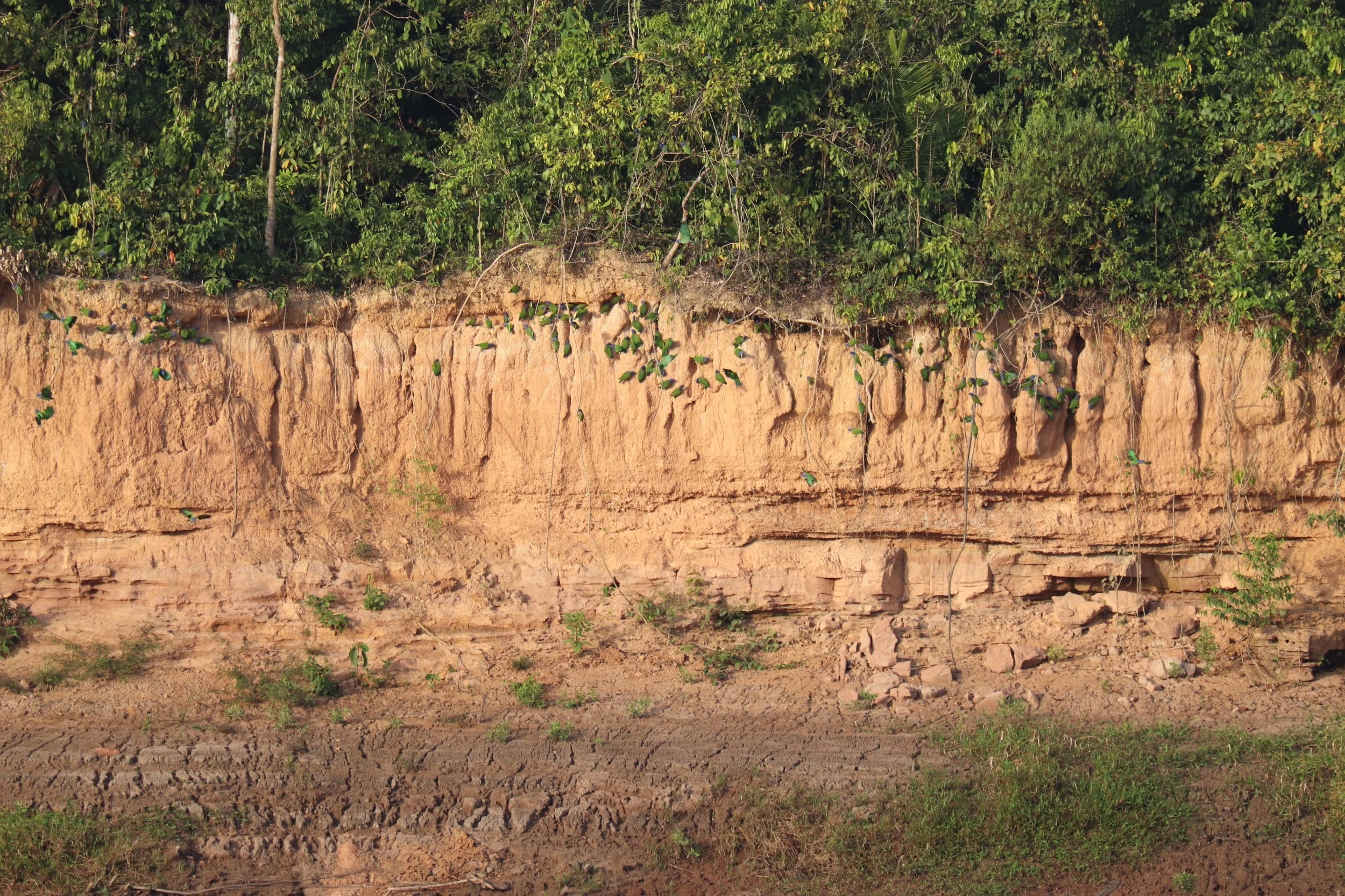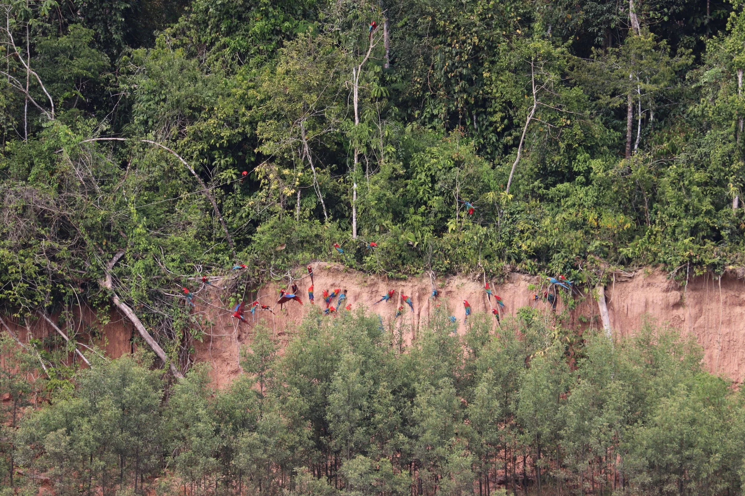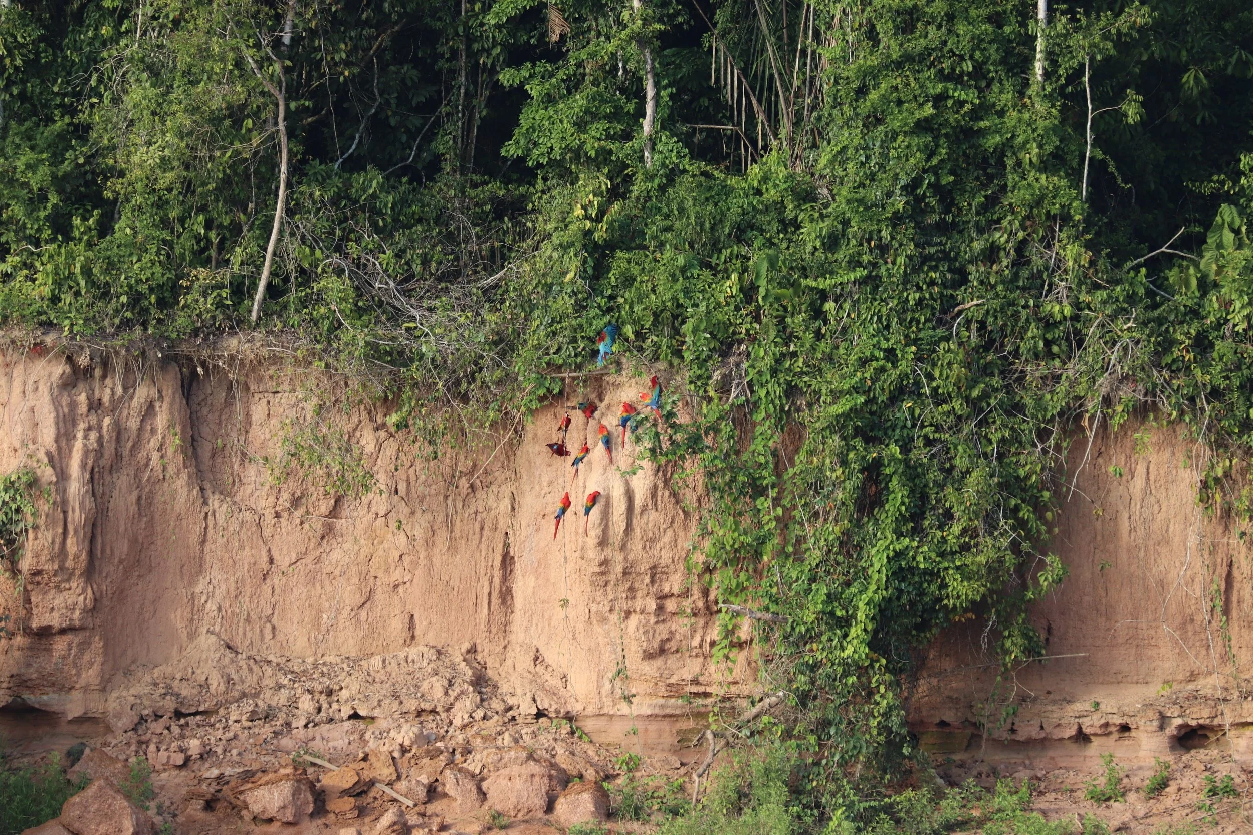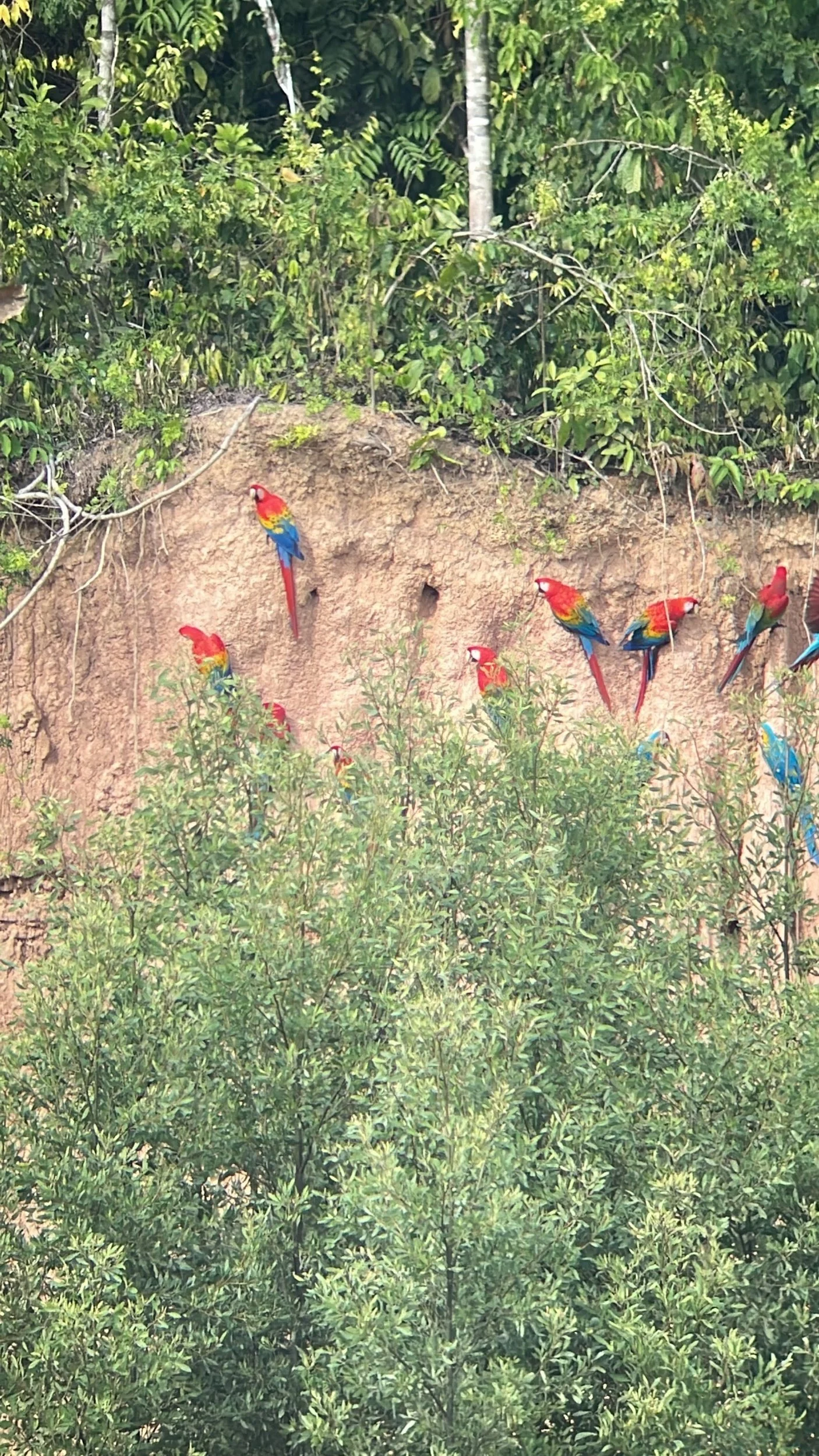 Coincidentally, our boat ride back to the bus took us through the clay lick with the macaws, and from the river, we could see the rest of our group on shore so we waved goodbye to them. And then on the other side of us was the clay lick with many macaws feasting on it: