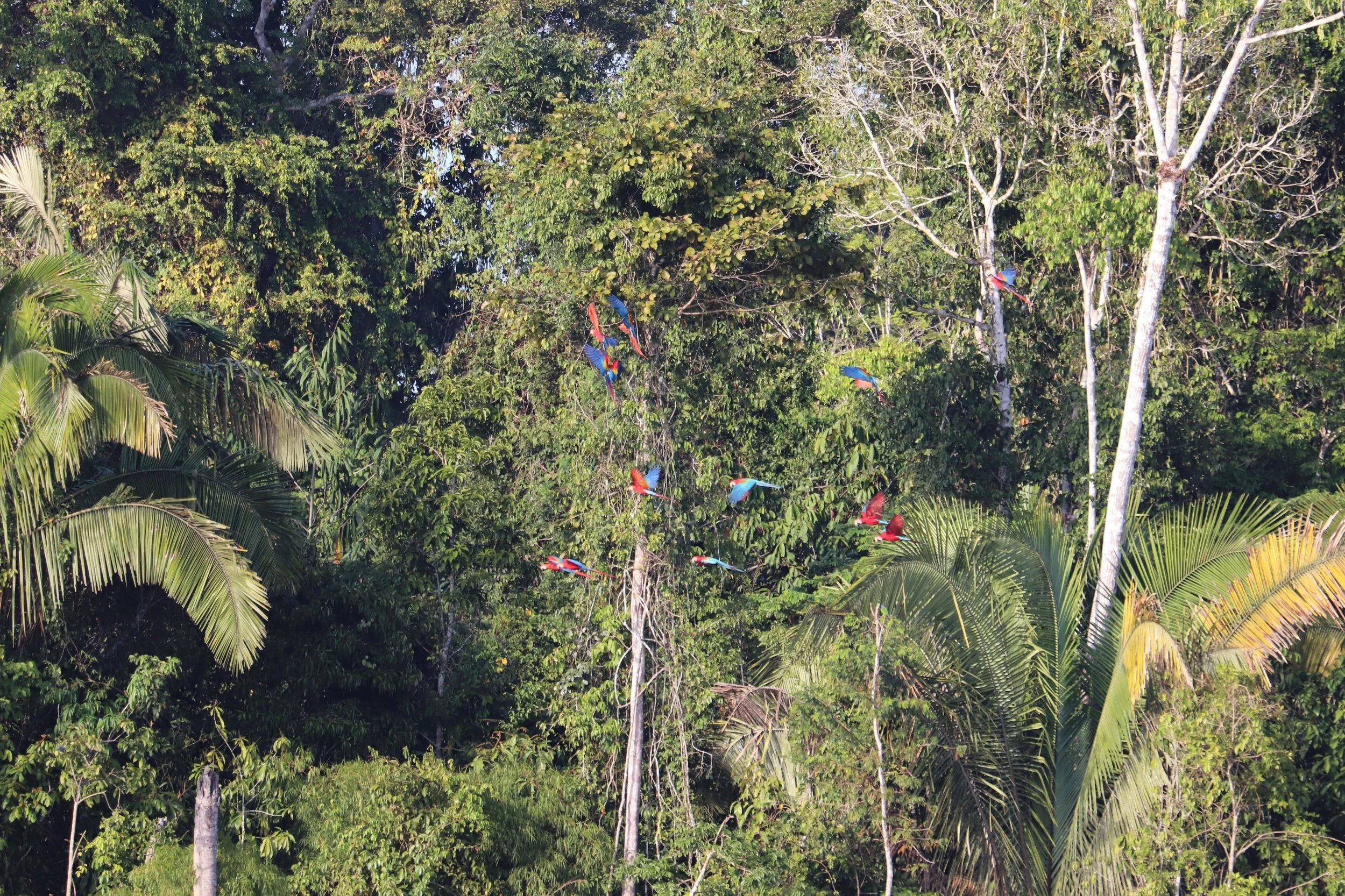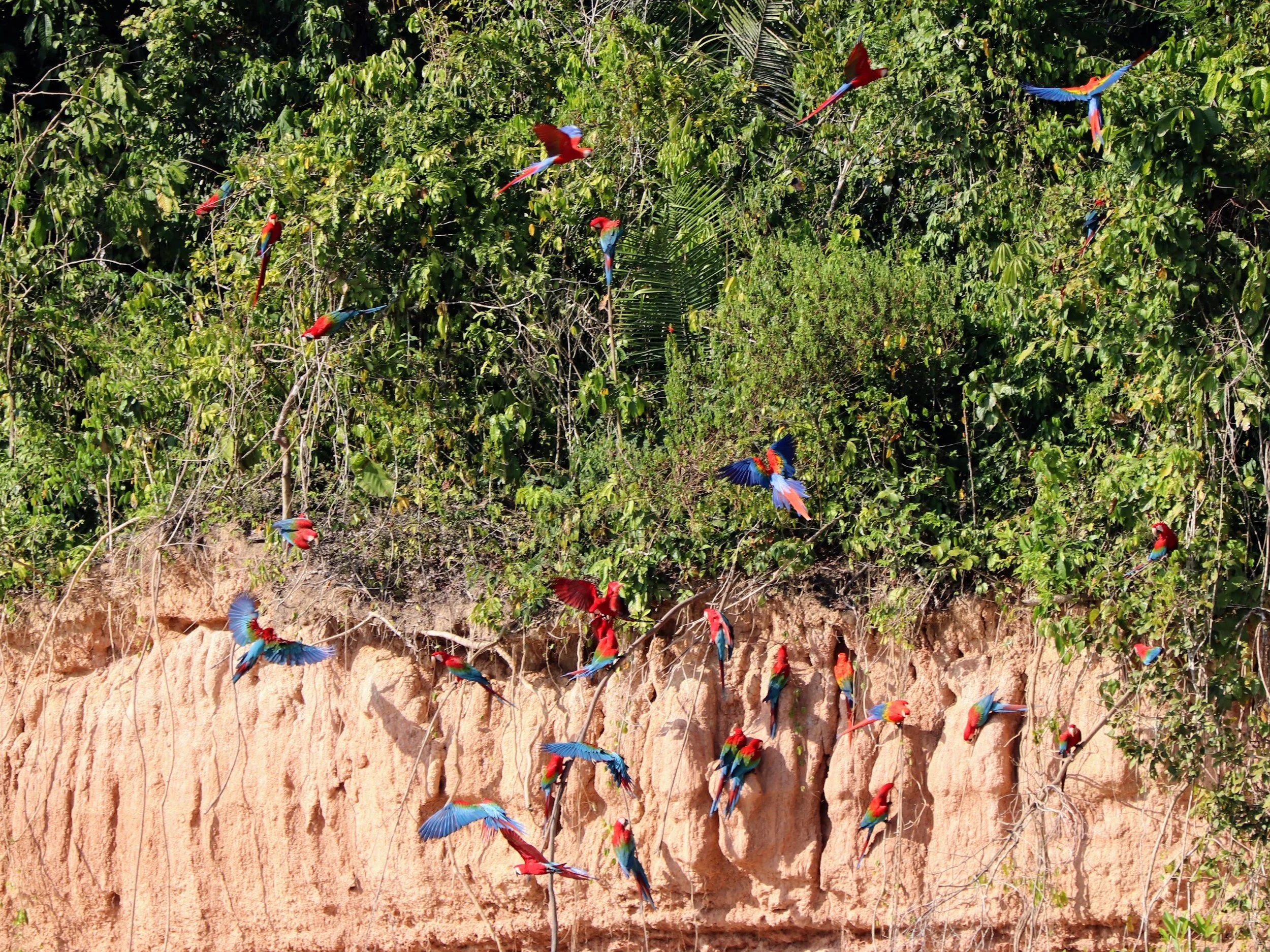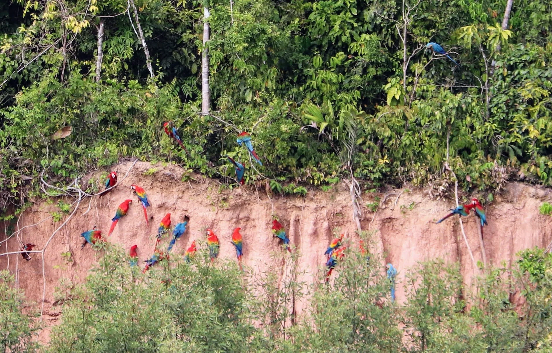 Coincidentally, our boat ride back to the bus took us through the clay lick with the macaws, and from the river, we could see the rest of our group on shore so we waved goodbye to them. And then on the other side of us was the clay lick with many macaws feasting on it: