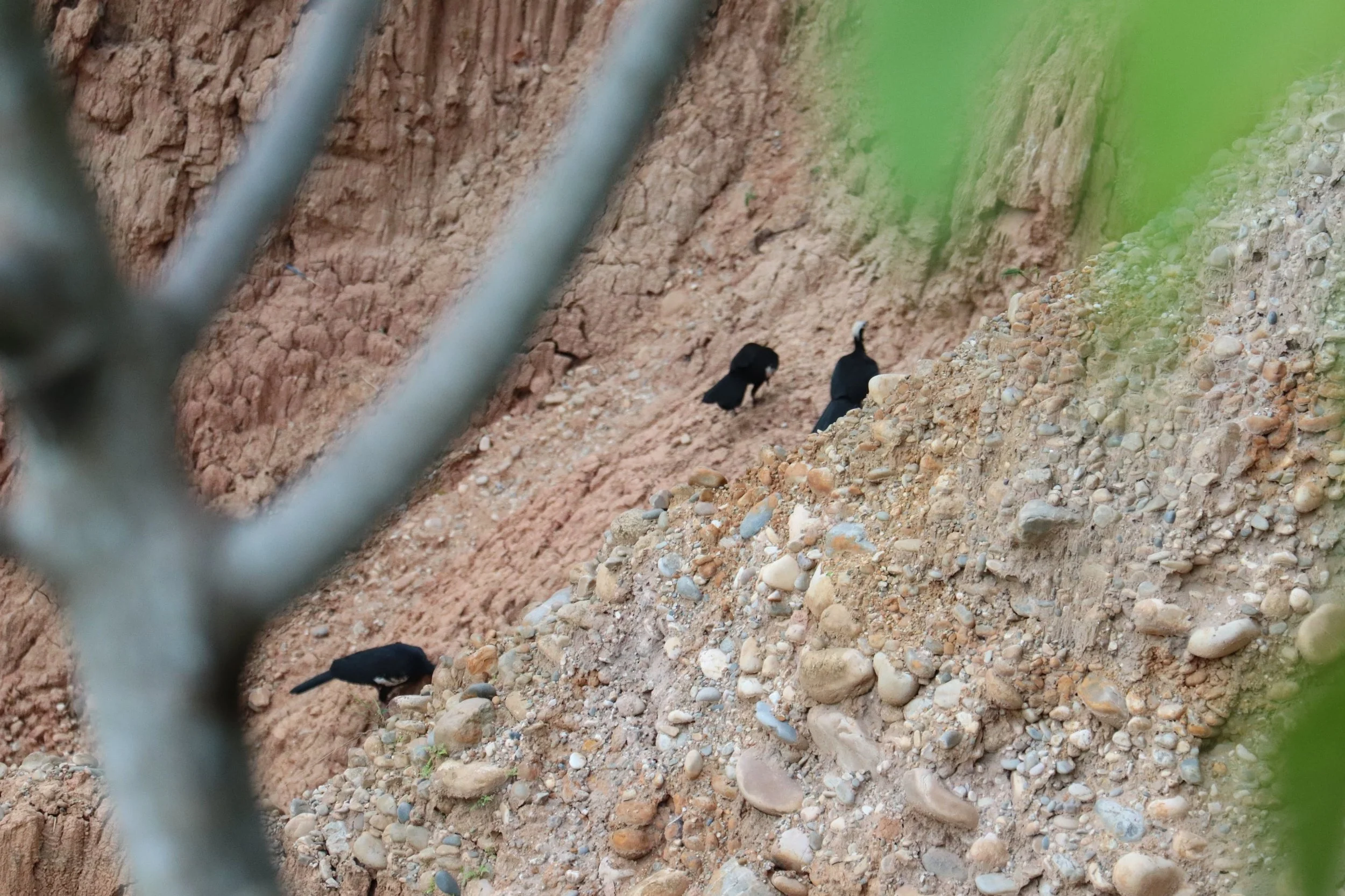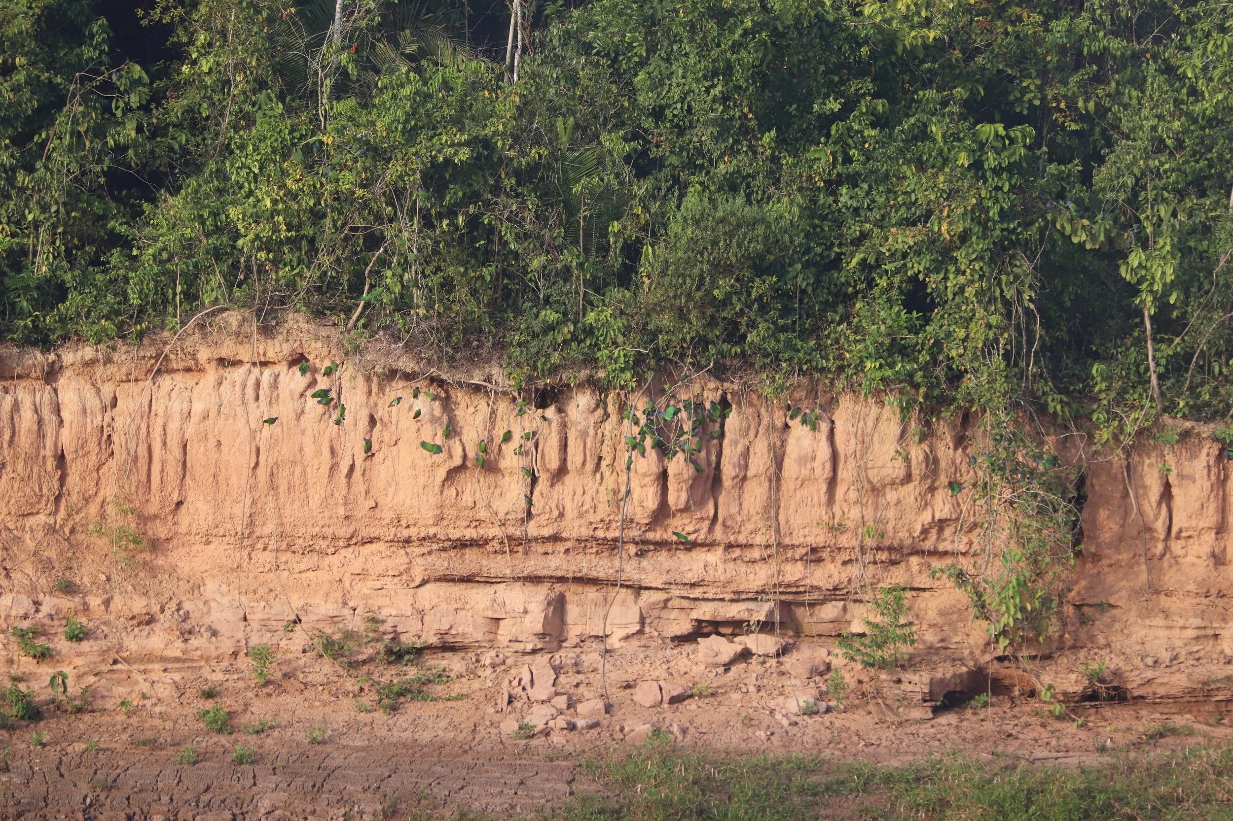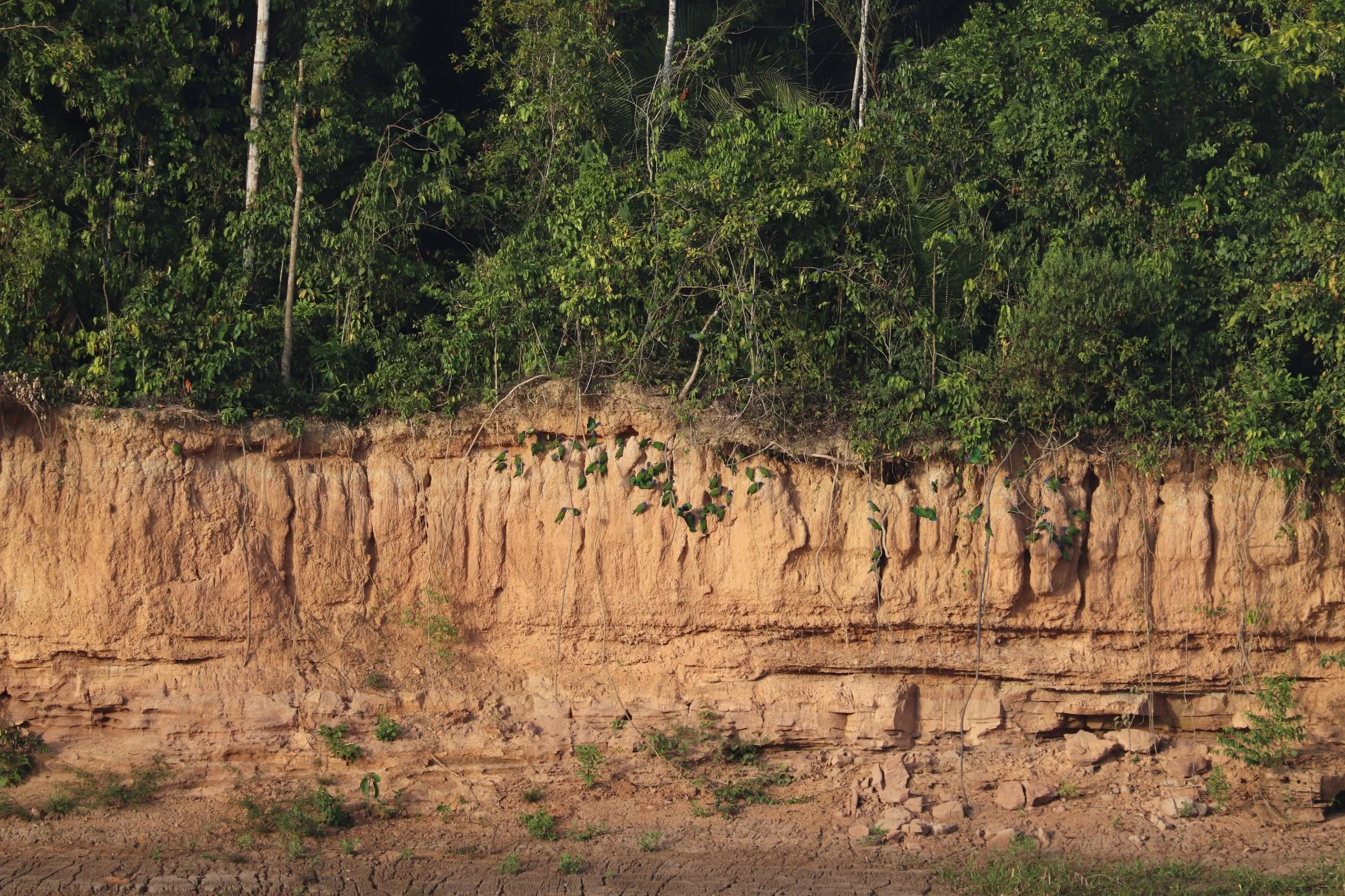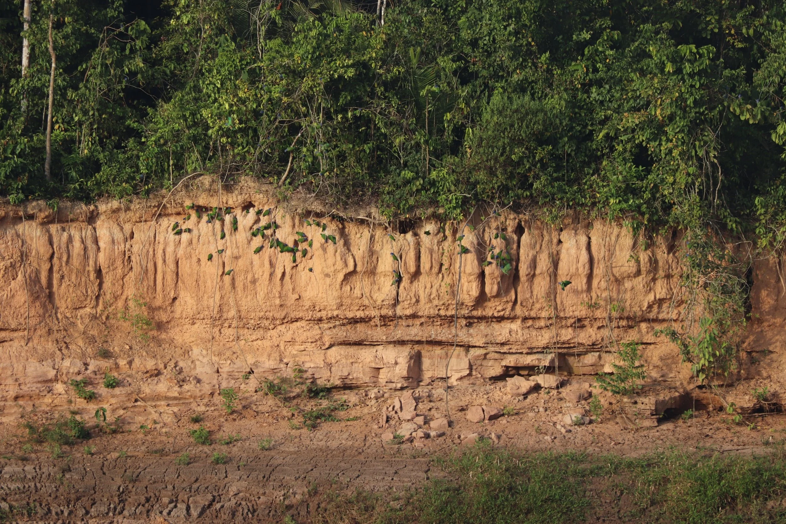 Coincidentally, our boat ride back to the bus took us through the clay lick with the macaws, and from the river, we could see the rest of our group on shore so we waved goodbye to them. And then on the other side of us was the clay lick with many macaws feasting on it: