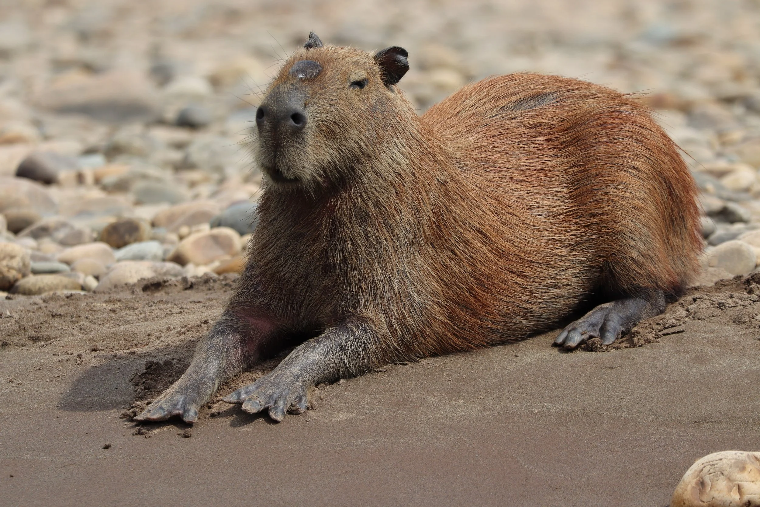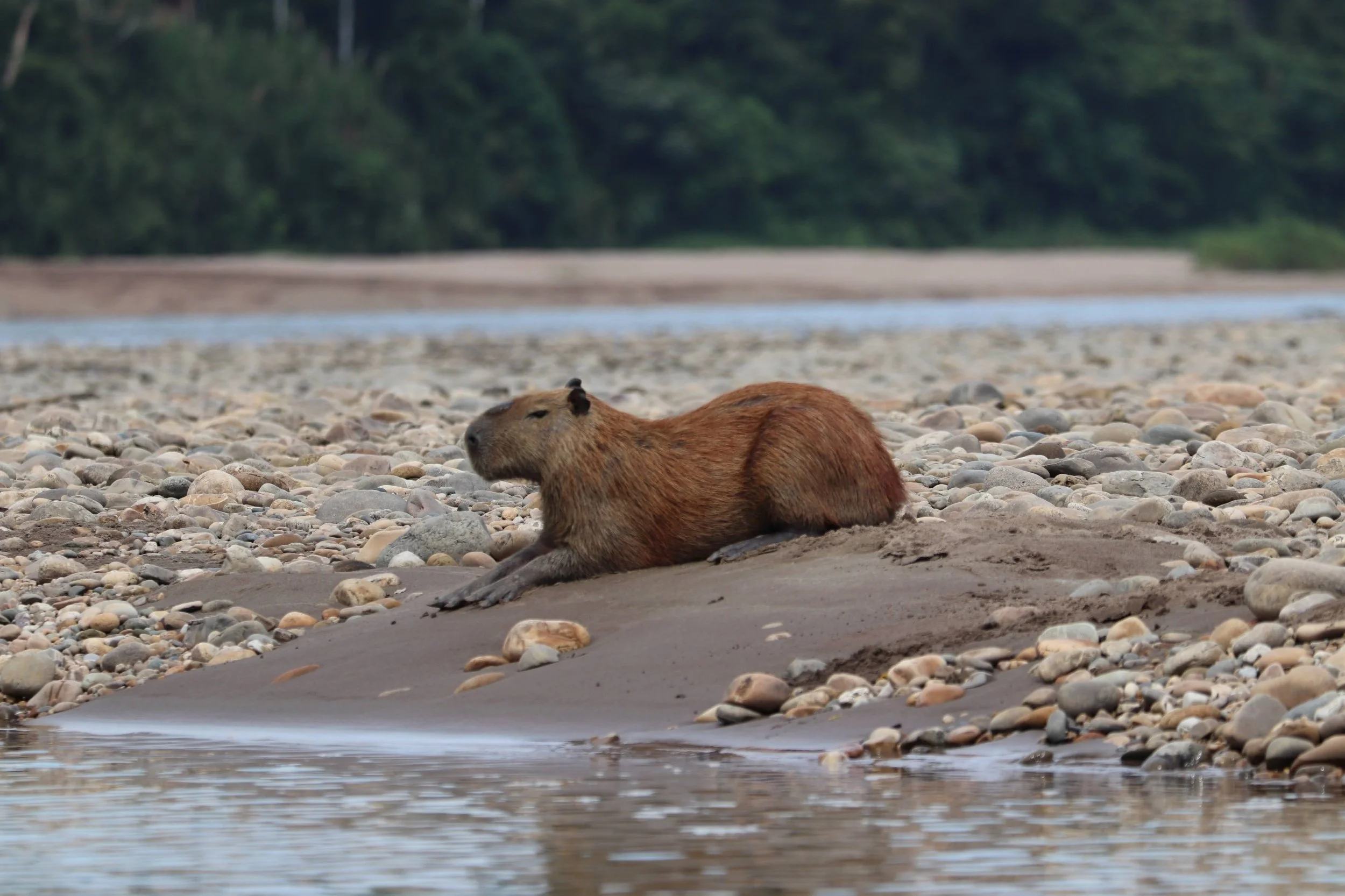 On the way back, we got badly stuck on a shallow section with pebbles; the same section where the day before, our driver had to get out to push. Well, this time it was a bit more stuck, so all the guides and the driver got out to push the boat. I had actually asked the guide near me if he needed Nick and me to push as well, but he said it was OK. After a few minutes, we made it over that same ridge and continued on back to the lodge where we saw a cute capybara sunbathing on the beach: