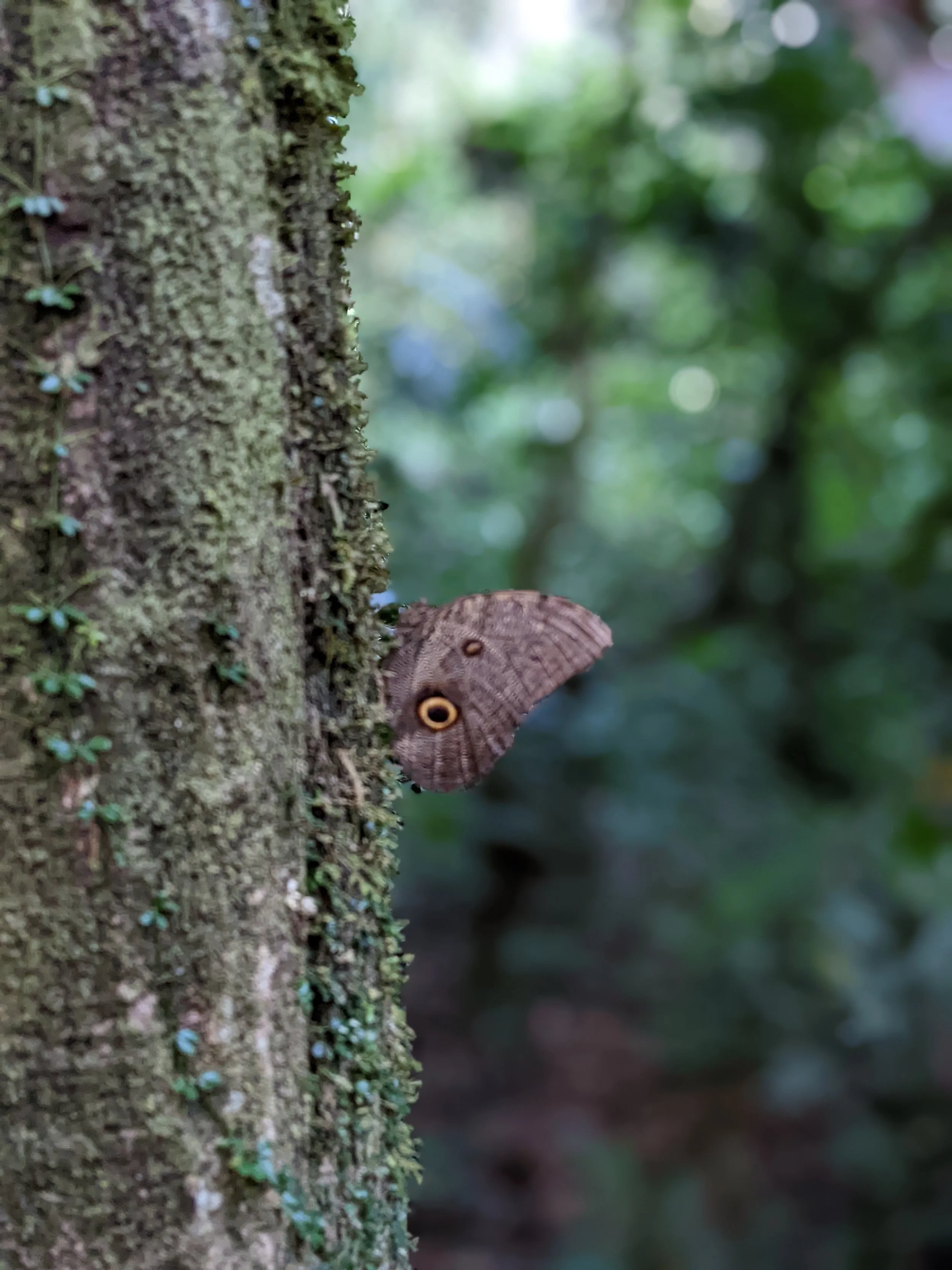 An owl butterfly was hanging out, and we were able to get a great view of the ‘eye’ that it uses to mimic an owl face. We didn’t want to scare it, so we were only able to get a side view today.
