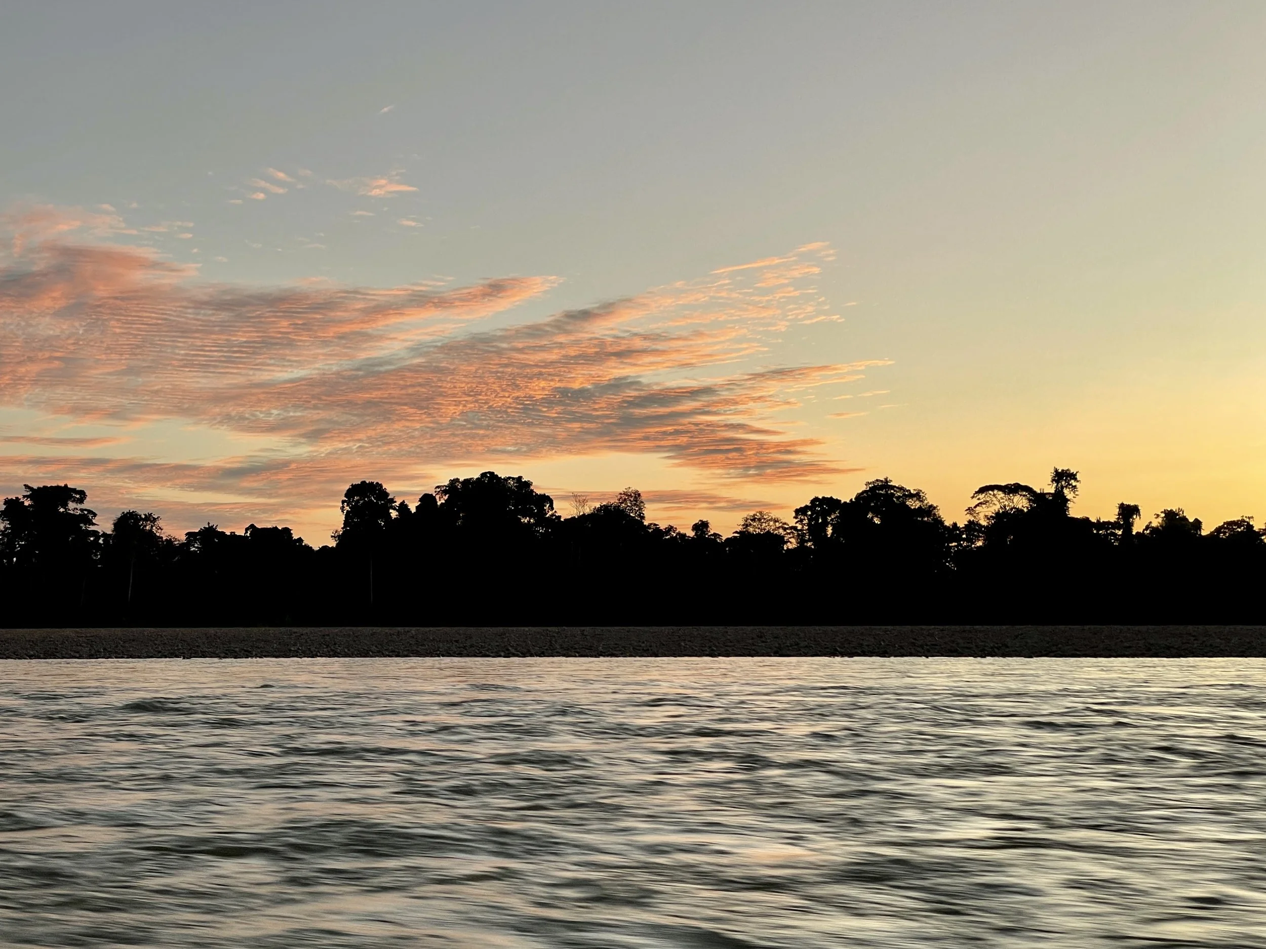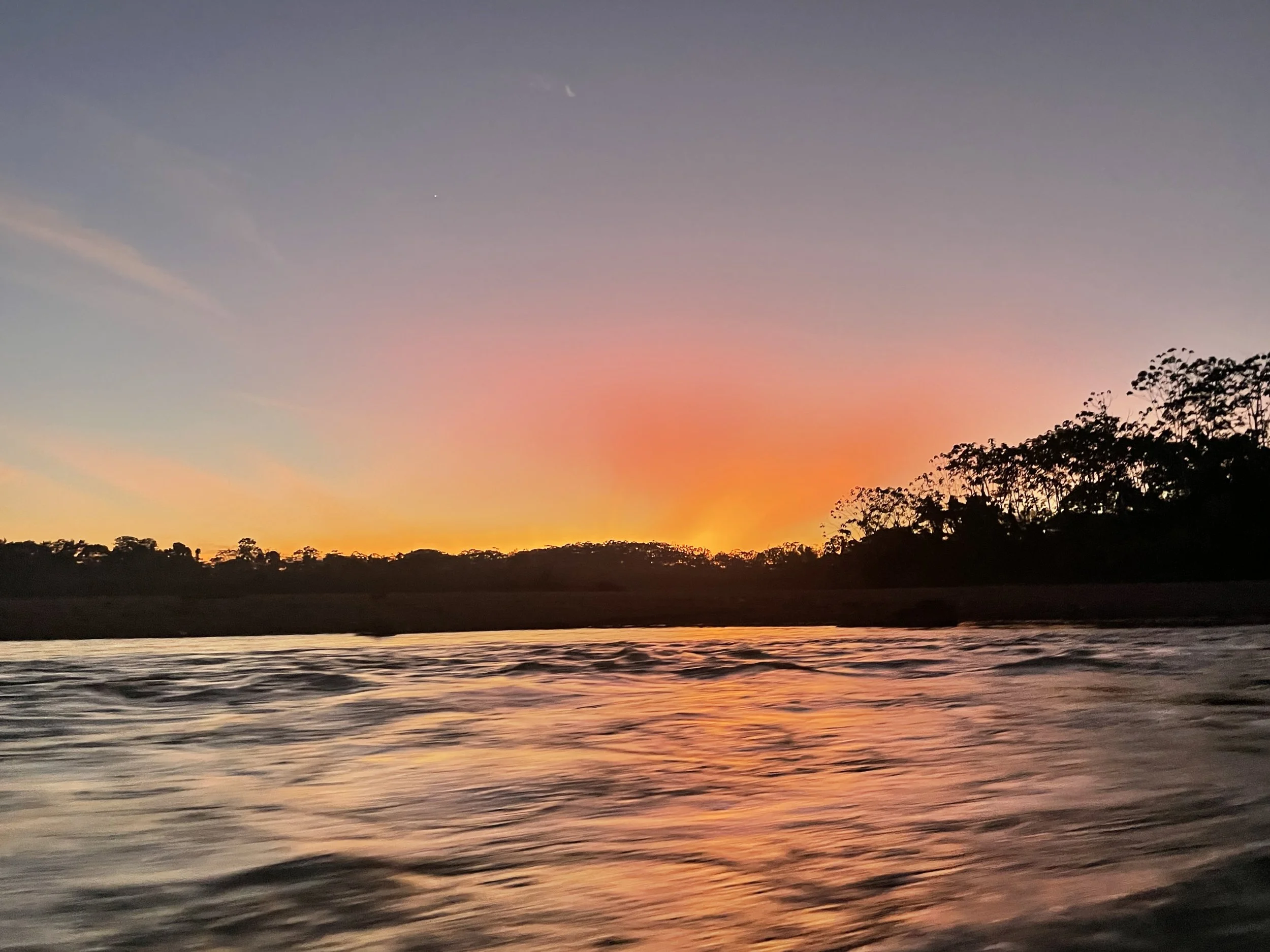 Dino informed our group that the first activity for the next day is to see the Macaw clay lick. Unfortunately, this meant that we would need to leave the lodge at 5:00am, so the next morning, we awoke at 4:45 in the pitch black of night in order to catch another boat ride to see macaws eat clay. Yes, birds here eat dirt to get salt and other minerals that are missing from the fruit they otherwise subsist on. More on that later; first, we had to get there, which meant getting to watch the sunrise from the river: