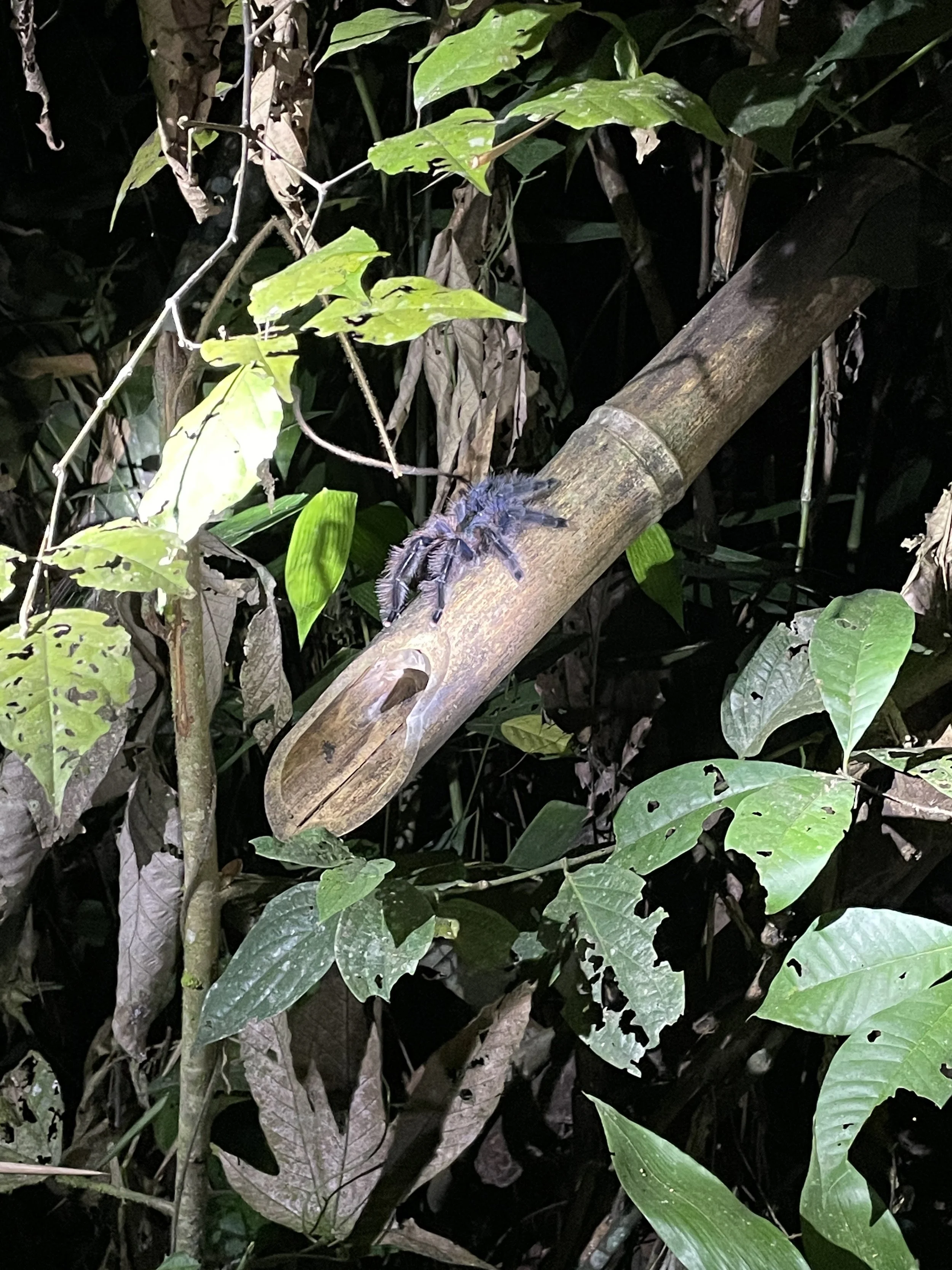 Yep, a tarantula just chilling out on bamboo. Dino said that it probably lives inside the bamboo, because tarantulas live in caves or holes of some sort. He continued to tell us that this one is venomous and will attack, and then decides to just pick it up!
